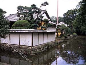 (16)二棟造り(ふたむねつくり) 九州の平野部福岡南部まで「くど造り」に混ざっ広く分布しています、正面から見ると「寄せ棟」ですが裏に廻ると平行二棟で間の雨仕舞いに様々な工夫がみられます。 |