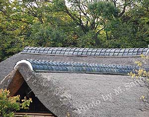 (40)瓦巻き(かわらまき) 棟積茅の半円に沿って丸みを帯びた瓦を被せた棟仕舞い、関東平野部に多く地域により3枚5枚があるが九州では1枚を見た。雁振瓦(がんぶりがわら)とも呼ばれる。 |